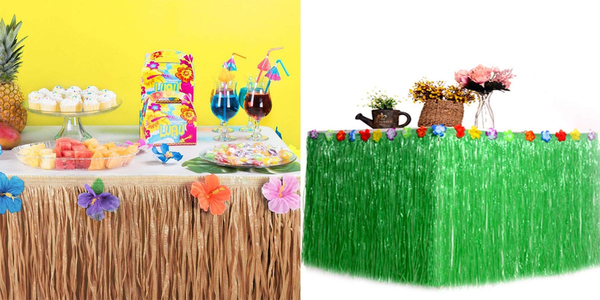 Table skirts are a commonplace item for wedding, birthday and any events. This table skirt features easy tailoring to table of any sizes. It comes with 10 pairs of self-adhesive stickers, 12 artificial palm leaves and 12 artificial flowers